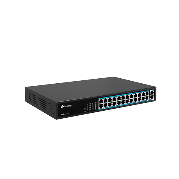 Milesight PoE Switch-serien har flere 10/100Mbps PoE-porte, der understøtter IEEE 802.3af / at-protokol og 2 uplink-porte, og giver et maksimalt strømbudget på 400 W til alle PoE-porte og 30 W for hver enkelt PoE-port, hvilket giver brugerne mulighed for at have flere forskellige konfigurerede kameravariationer.